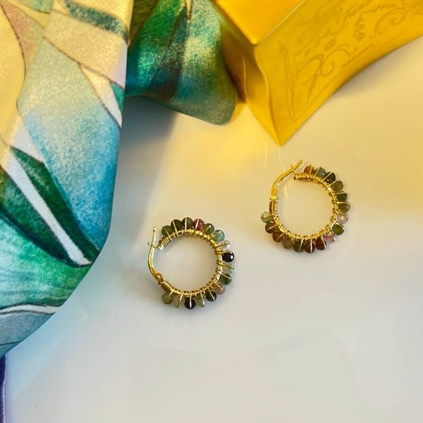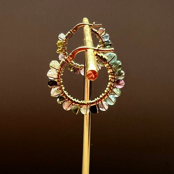 Deze verfijnde, handgemaakte, creolen zijn met zorg handgemaakt in verguld zilver en rijkelijk bezet met kleine toermalijnsteentjes in tinten van groen, roze, honing en rookgrijs.