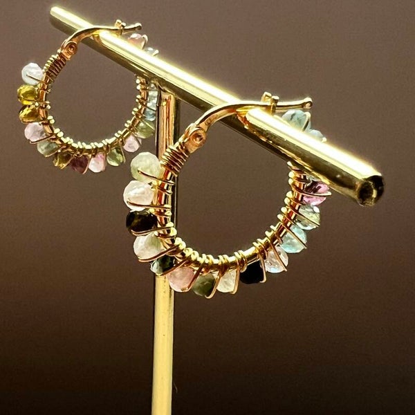 Een speels en elegant paar creolen waarin facetgeslepen toermalijnen het licht vangen in een zacht regenboogpalet.