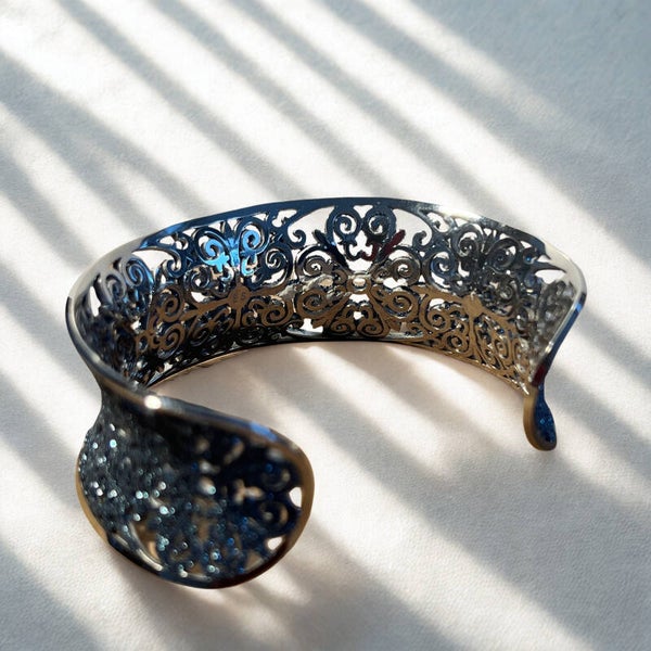 Het opengewerkte patroon vangt het licht op elegante, subtiele wijze, waardoor de armband schittert bij elke beweging — als sterrenstof in de nacht.