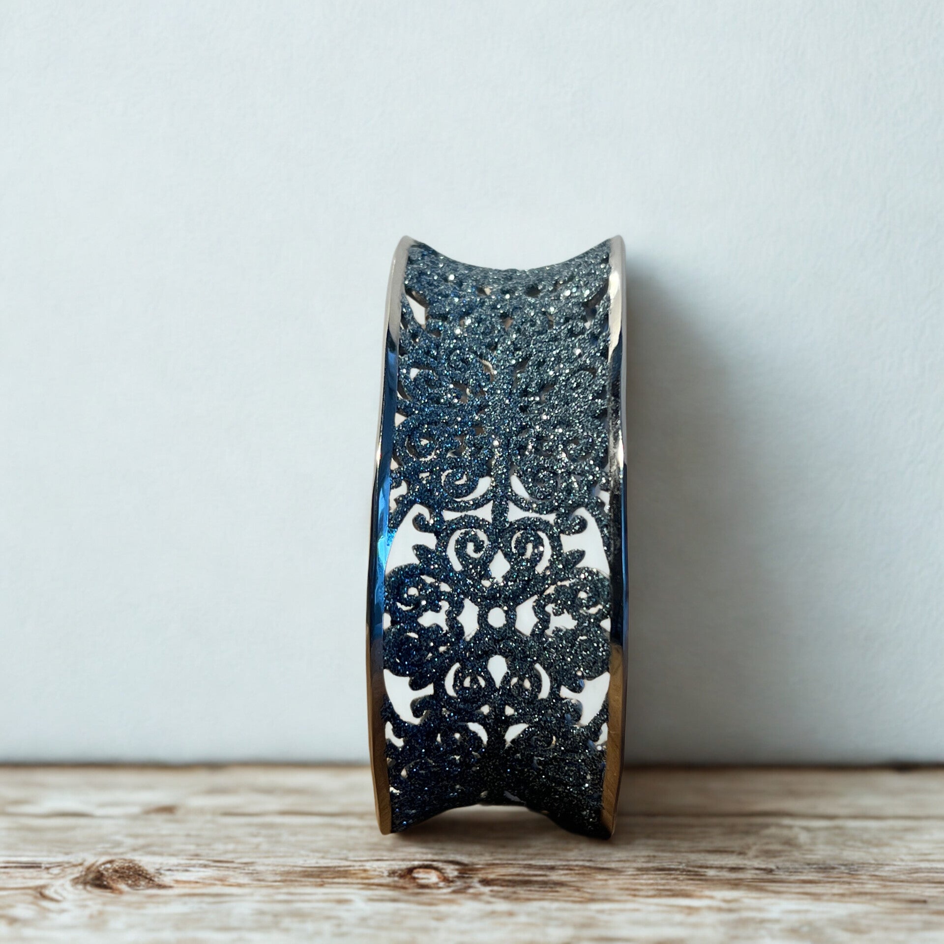 Een betoverende manchetarmband in gepolijst roestvrij staal, bezet met een fonkelende laag mineraalstof in diepblauw.