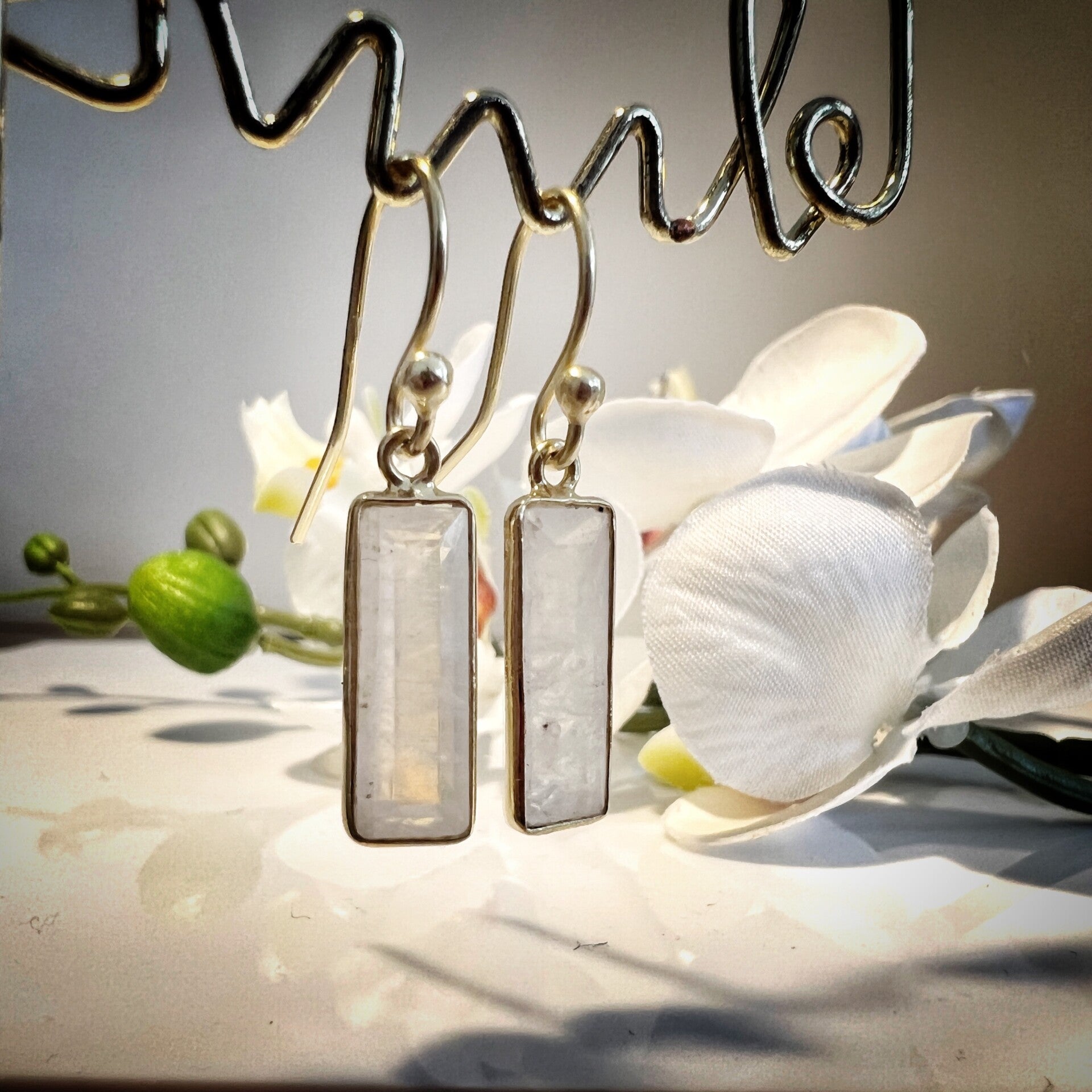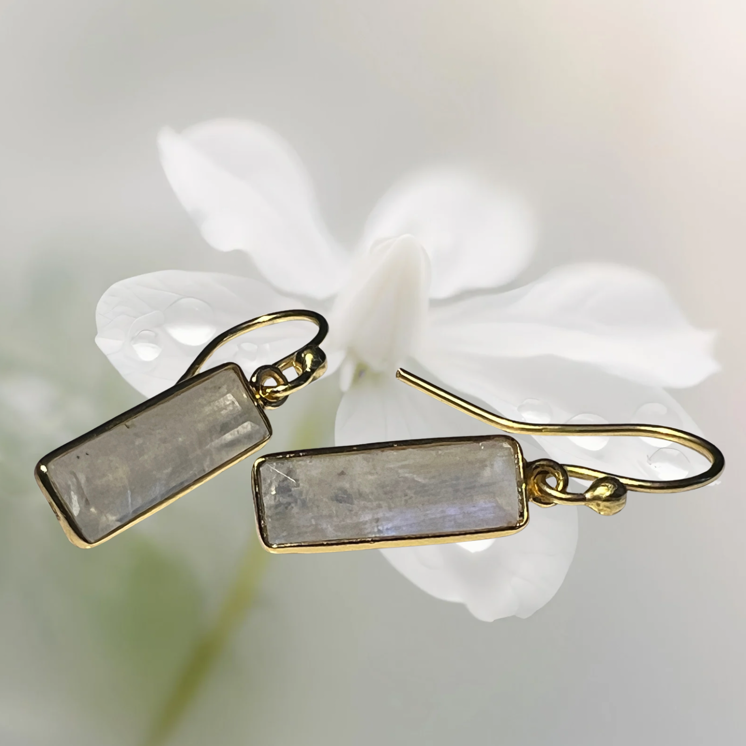 Fijne rechthoekige oorbellen met natuurlijke maansteen — zacht iriserend van kleur, elegant en tijdloos.