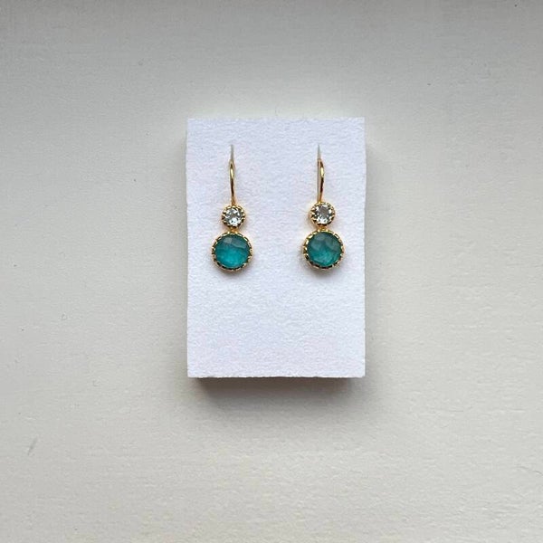 Goldplated oorbellen met turkoois gekleurd kwarts en blauwe topaas