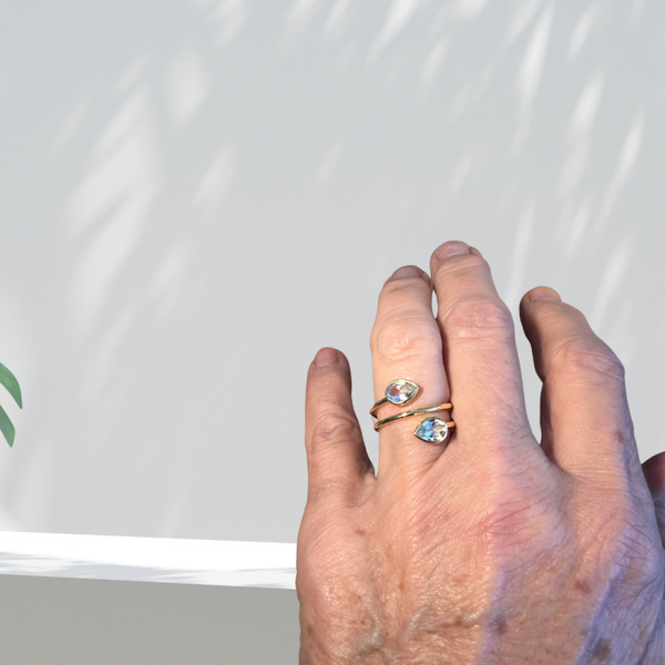 - Edelstenen: lichtblauwe topazen (facetgeslepen, behandeld)