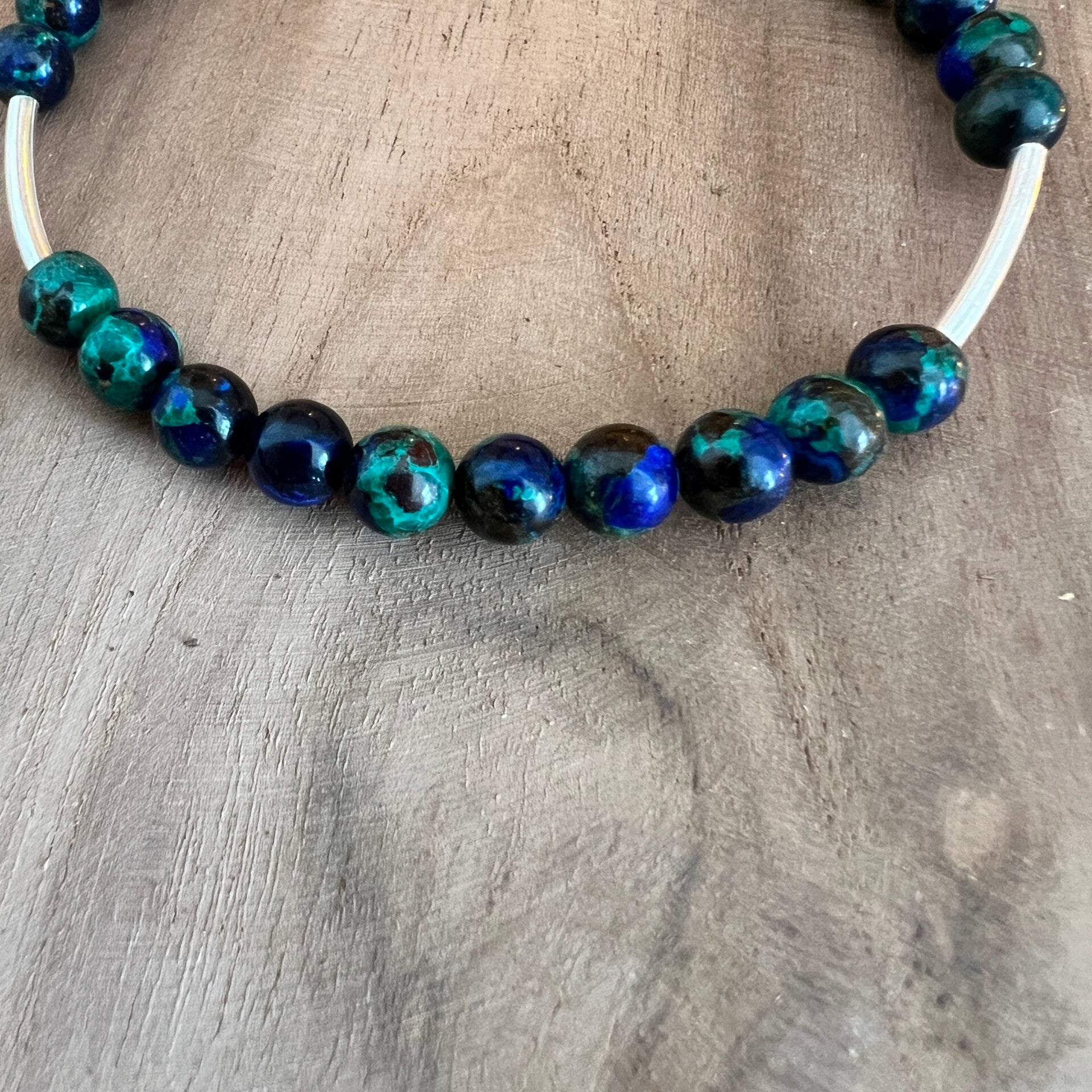 Vervaardigd uit Malachiet-Azuriet kralen van 6 mm, verfijnd afgewerkt met kleine zilveren details.