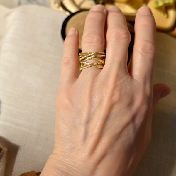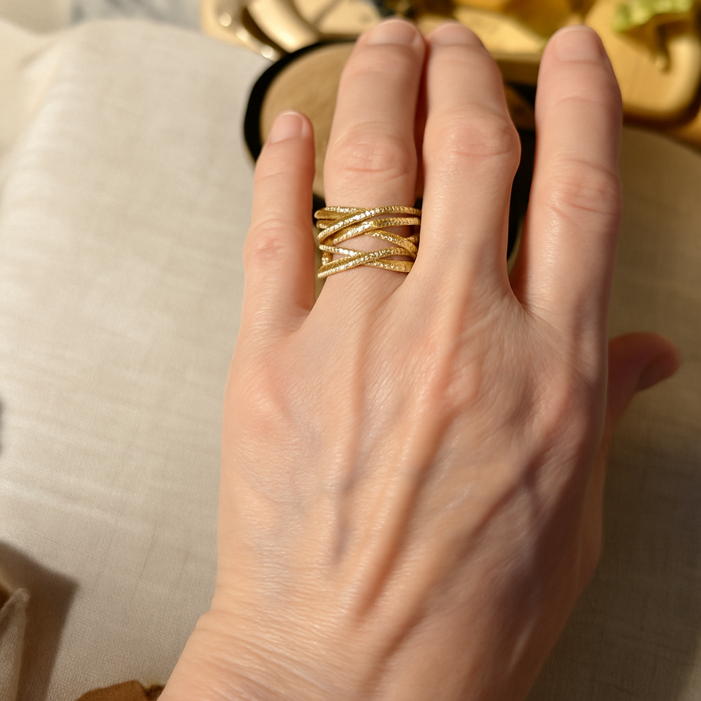 De meerdere slanke banden kruisen vloeiend over elkaar en vormen een luchtig, verfijnd ontwerp. De subtiele zirconia-steentjes zorgen voor een elegante glans bij elke beweging — stijlvol, tijdloos en perfect om elke dag te dragen.