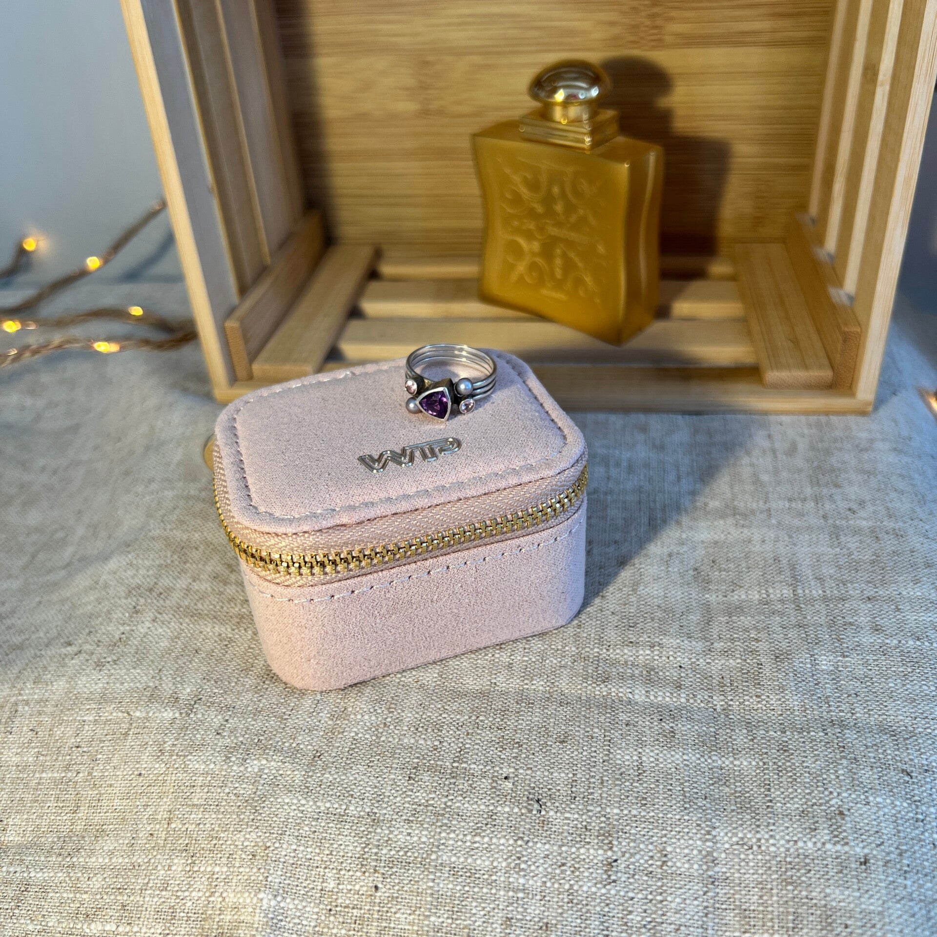 Luxe mini-etui voor één tot drie ringen.Perfect om je favoriete ringen beschermd en elegant mee te nemen, thuis of op reis.