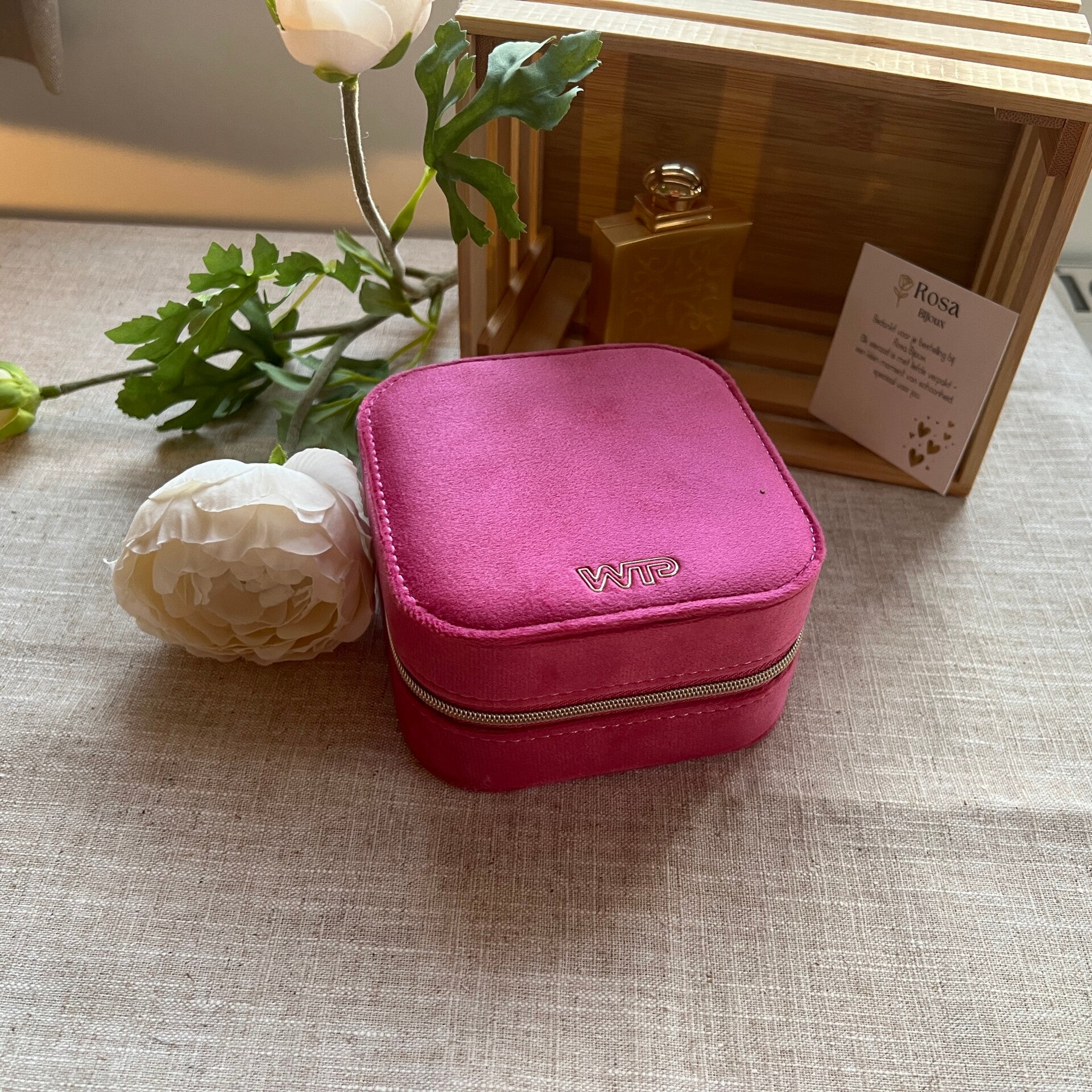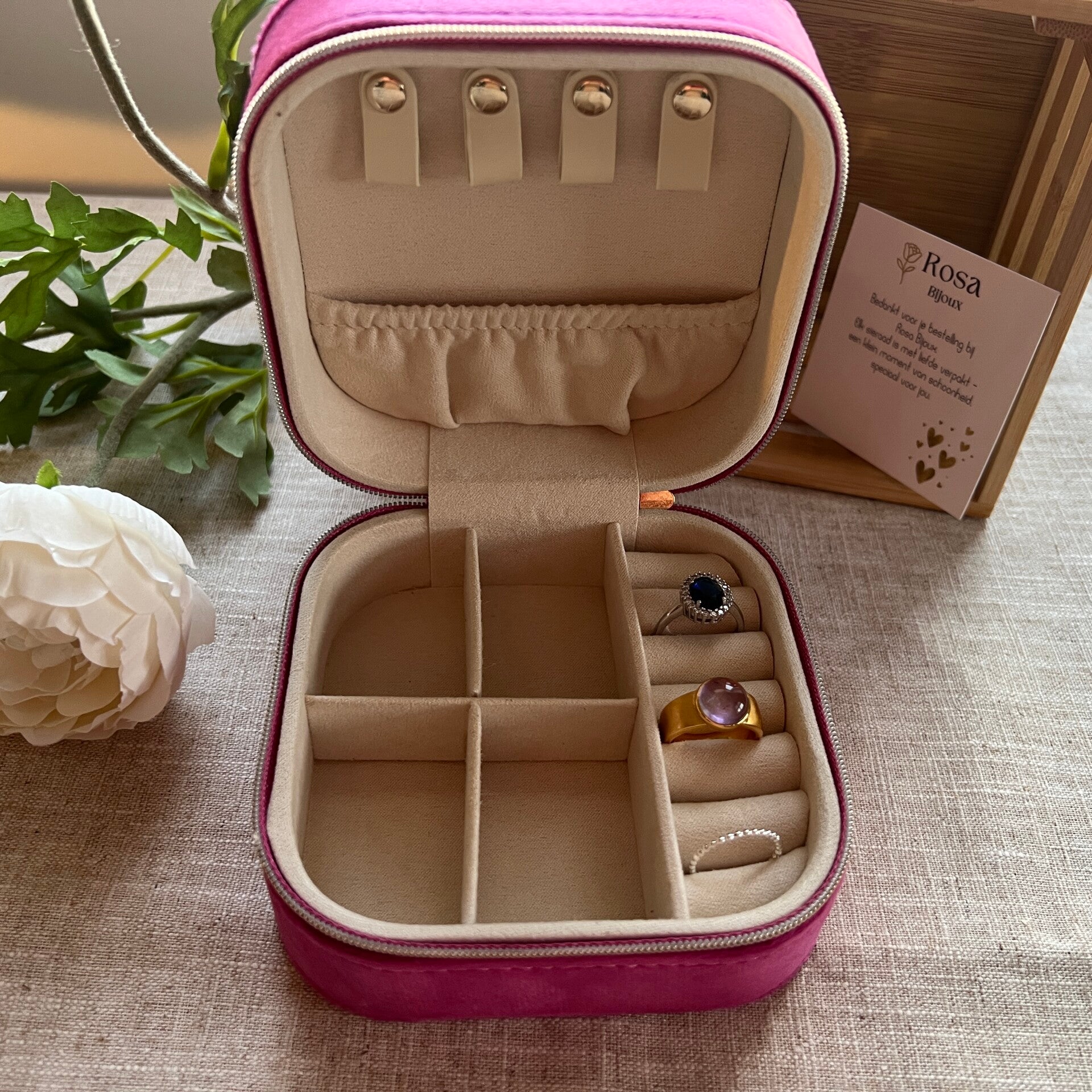 Luxe vierkant reisetui in fuchsia veloursStijlvol, compact en ideaal voor onderweg.Met ringrollen, vakjes en een elastiekvak — sieraden blijven netjes georganiseerd en veilig opgeborgen.
