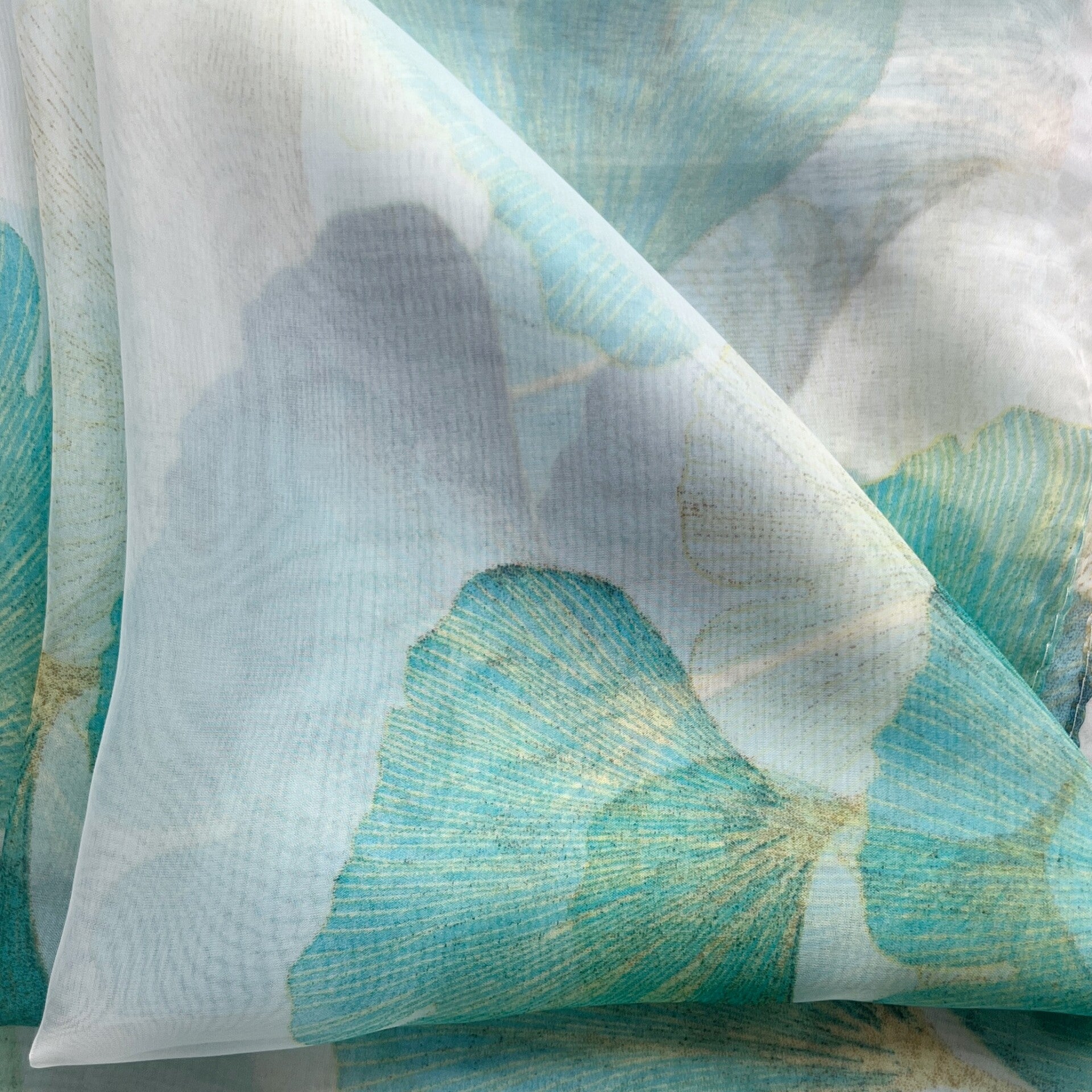 Een lichte, transparante sjaal met een print van turquoise ginkgobladeren, uitgevoerd in een luchtige stof die soepel valt.