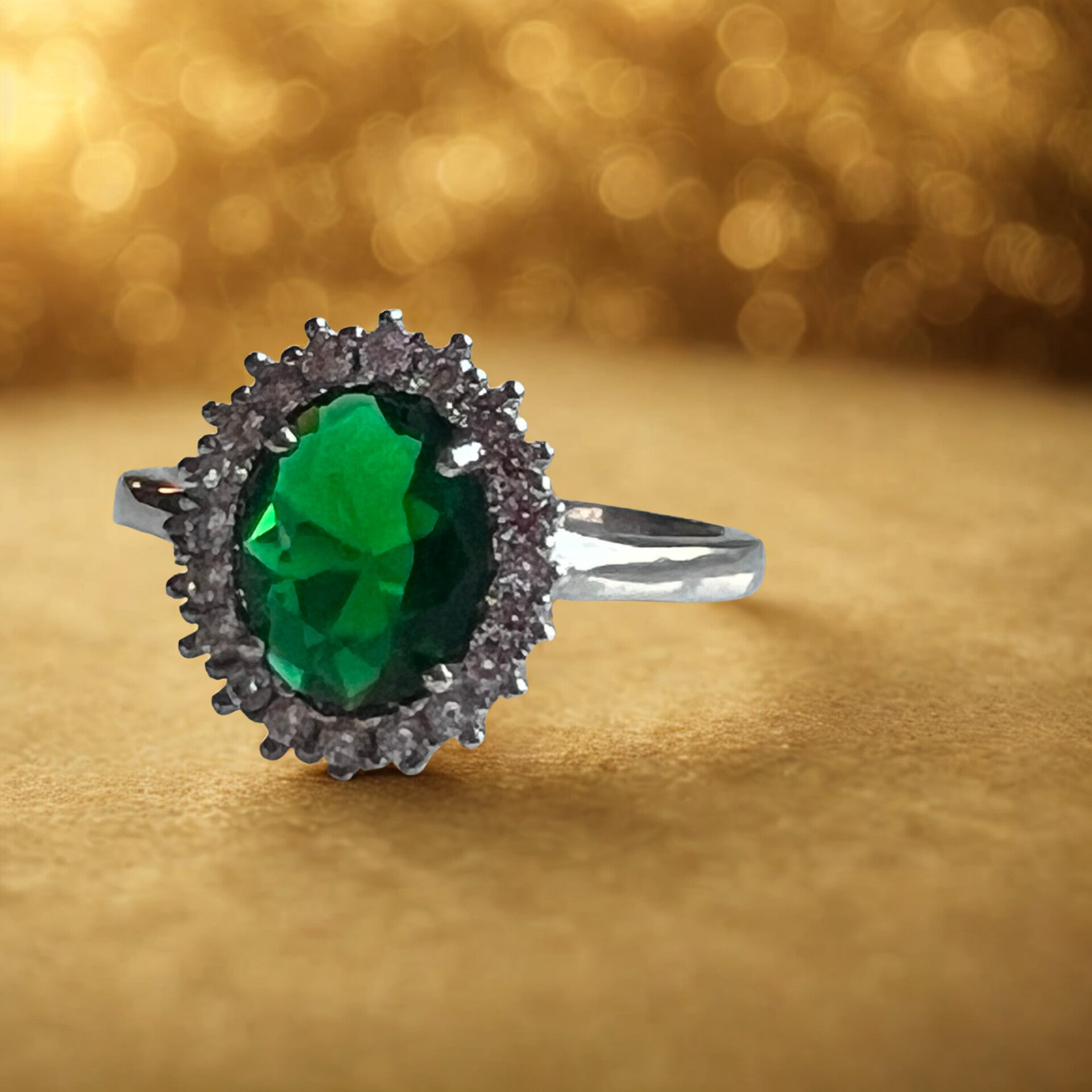 Een stijlvolle ring die schittert in diepe smaragdgroene tinten en elke outfit een luxe, elegante uitstraling geeft.