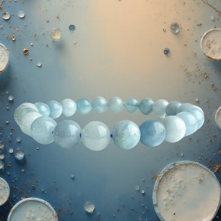 Een verfijnde aquamarijn armband in zachte, natuurlijke blauwtinten, samengesteld uit kleinere ronde kralen van 8 mm.