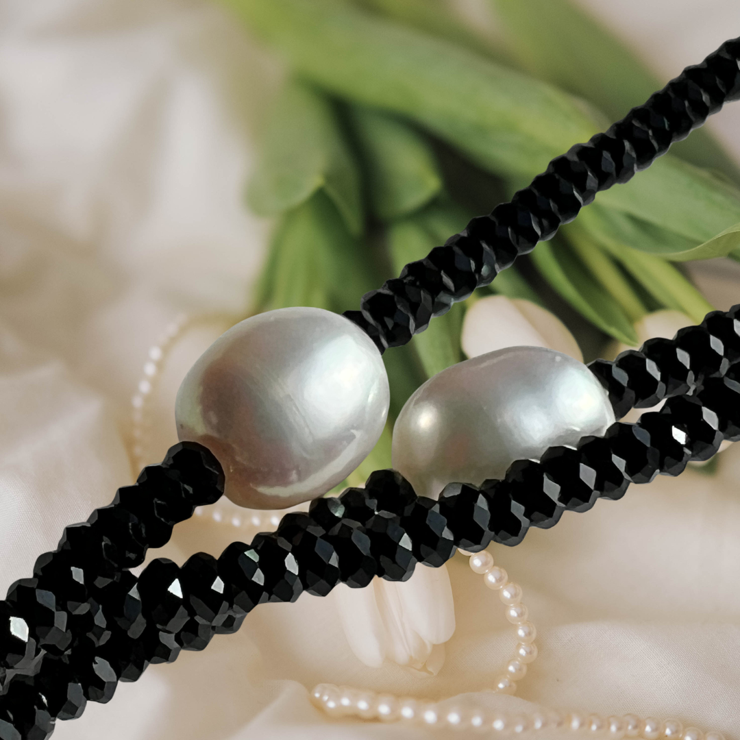 Zwarte spinel met een subtiele diamantglans, gecombineerd met natuurlijke zoetwaterparels.