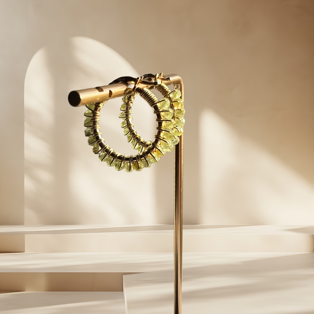 Subtiele creolen met facetten peridot die het licht vangen bij elke beweging.